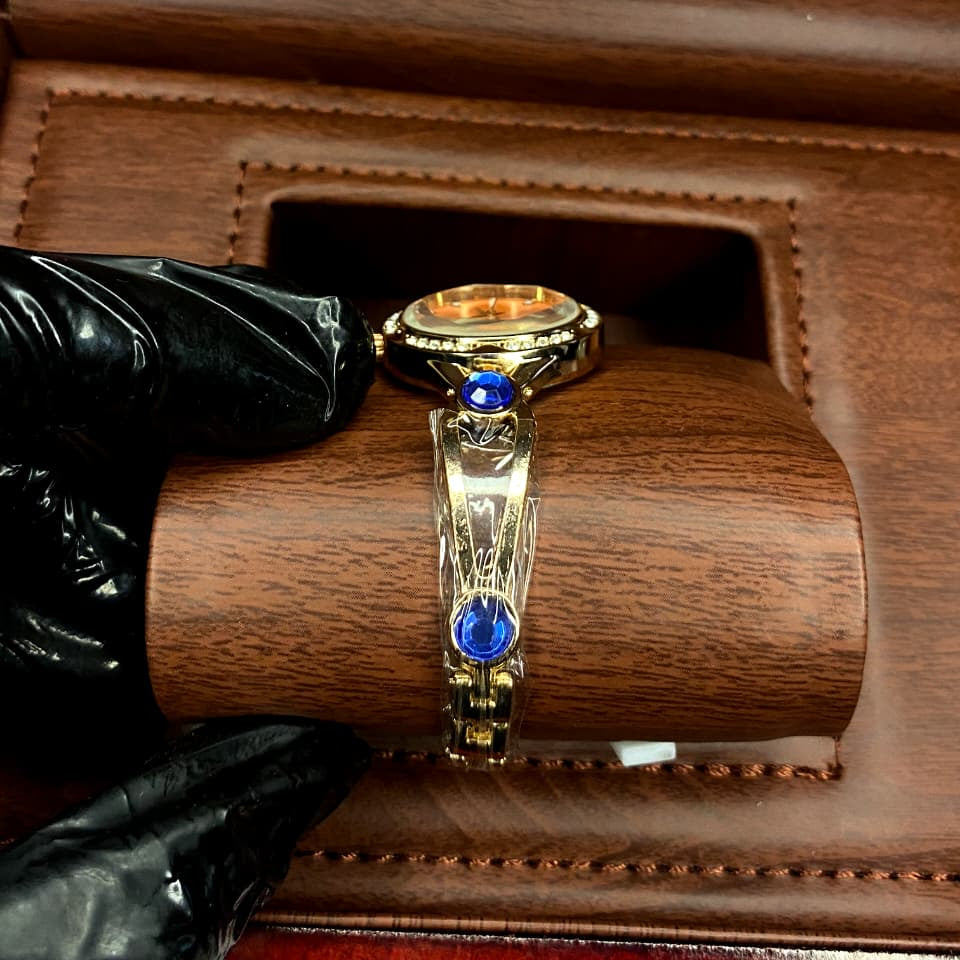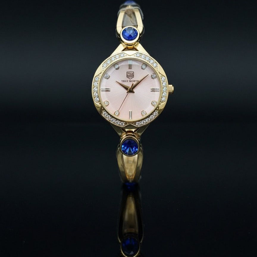 Crafted with meticulous attention to detail, the "Eternal Elegance" features a polished gold-toned stainless steel casing that perfectly complements its delicate pink dial. The bezel, adorned with dazzling rhinestones, catches the light with every movement, creating a captivating sparkle. Adding to its unique charm, the watch boasts two prominent sapphire-blue stones integrated into the bracelet, providing a striking contrast and a pop of vibrant color. The band itself offers a refined matte look, ensuring both comfort and a contemporary aesthetic that stands out without being overtly flashy. Whether you're attending a formal event or simply adding a touch of glamour to your daily ensemble, the "Eternal Elegance" watch is designed to elevate your style.