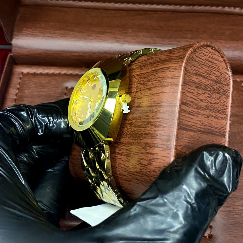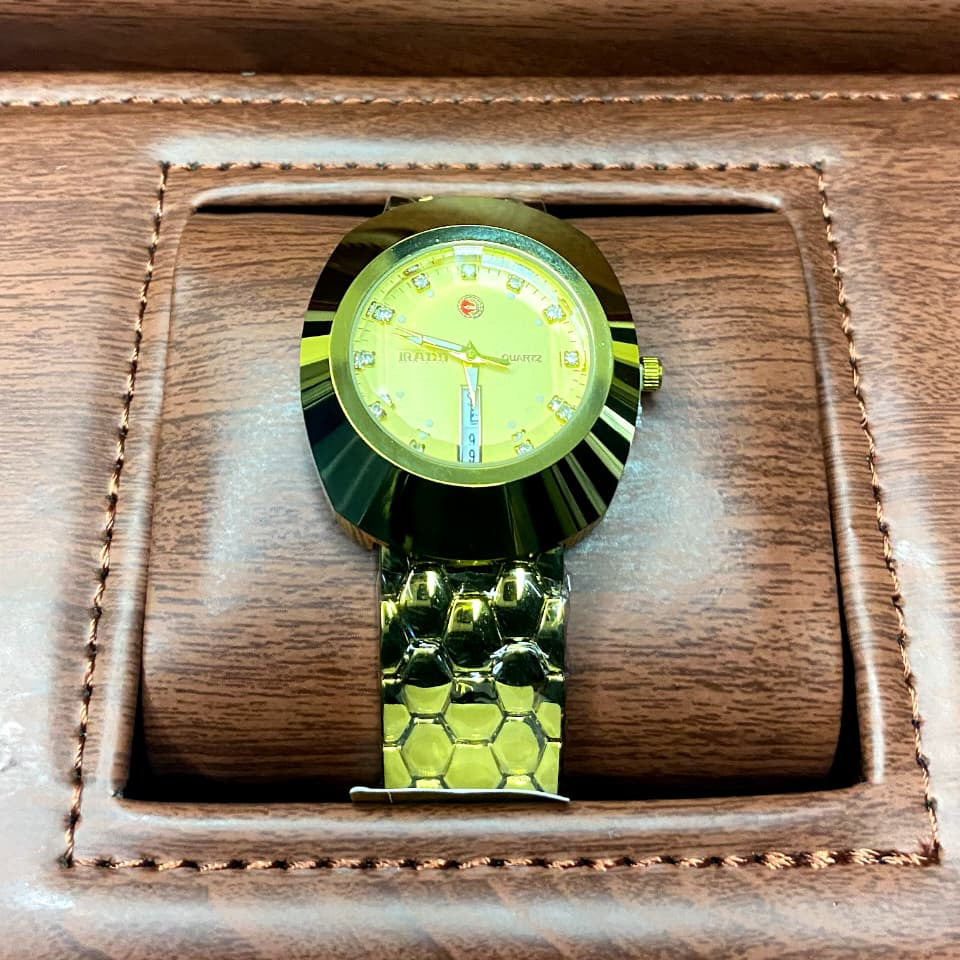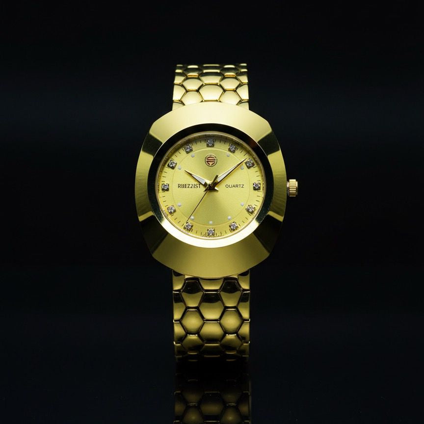 یہ گھڑی اعلیٰ تعمیر کا ثبوت ہے، جس میں سونے کے ٹن کے شاندار فنش کے ساتھ دلکش اعلیٰ معیار کے سٹینلیس سٹیل کی تعمیر ہے۔ اس کی سب سے خاص خصوصیت شہد کے چھتے کے پیٹرن والا منفرد بریسلیٹ ہے، جو ایک آرام دہ اور لچکدار فٹ فراہم کرتا ہے جبکہ سر کو موڑنے والی بصری ساخت پیش کرتا ہے۔ بیزل کے پالش کروز سے لے کر خوبصورت ڈائل کے ہموار انضمام تک گھڑی کی بے عیب معیار کی فنشنگ ہر تفصیل سے واضح ہے۔ نفیس ڈائل پر لطیف rhinestones کے ساتھ لہجہ کیا گیا ہے، جس میں سمجھدار چمک کا اضافہ ہوتا ہے۔ ذہین ماسٹر لاک بندش آپ کی کلائی پر ایک محفوظ اور پراعتماد فٹ ہونے کو یقینی بناتا ہے، ایک چیکنا، کم پروفائل ڈیزائن کے ساتھ اعلی درجے کی فعالیت کو یکجا کرتا ہے۔
